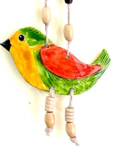 This is a sample of what I do with my clay birds – I like to paint with bright colours, in this case I used a specialised glass paint and then glazed with UV resin to add a glossy finish but also adding strength and protection to the air dry clay.