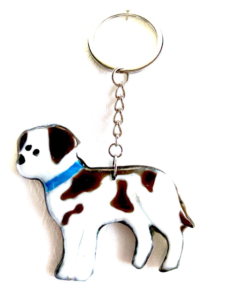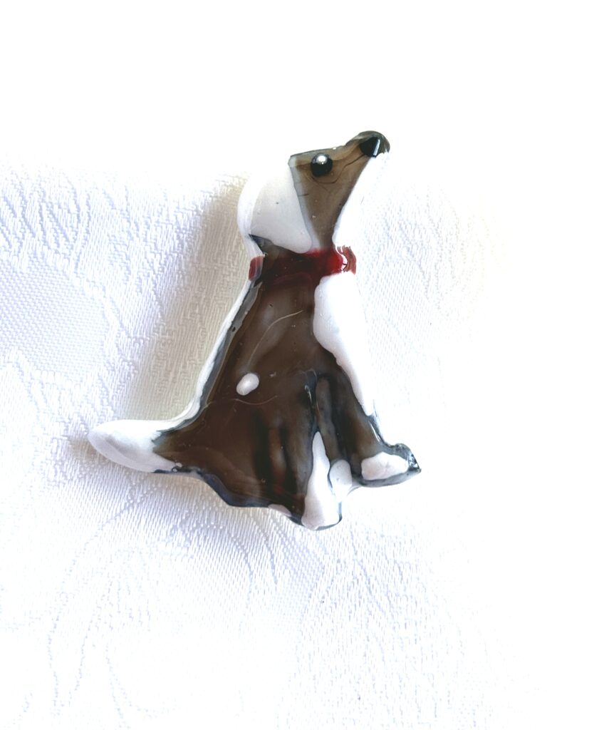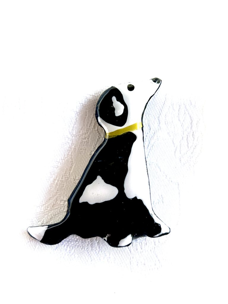 The Dogs are transformed into cute keyring – Bag Charms and Brooch Pins, They make great unique handmade dog lover gifts. Again made with air dry clay and glazed with UV resin, the colouring is all resin inks and dyes.