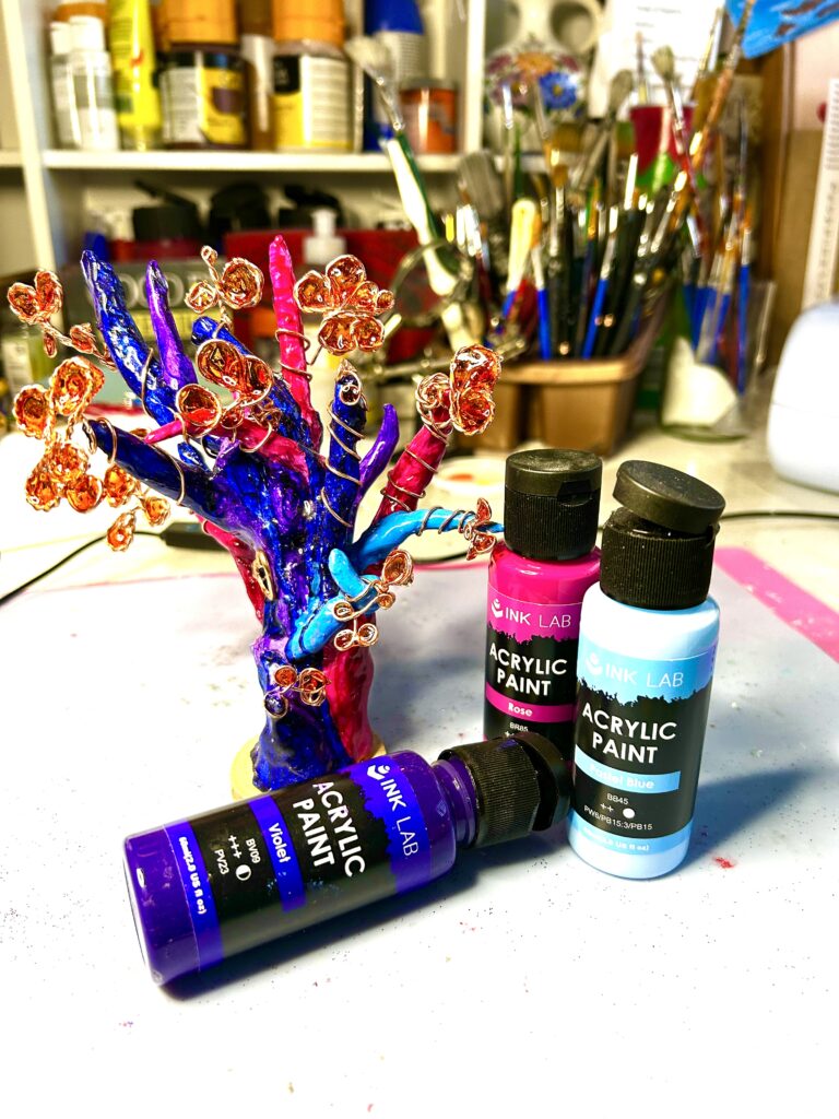 I use acrylic paints to add depth and colour before sealing with resin. They blend beautifully and allow me to create layered tones