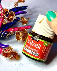 In the photo you can see I have used glass paint over resin to create translucent amber tones in my resin details. It gives a stained-glass effect when layered.
